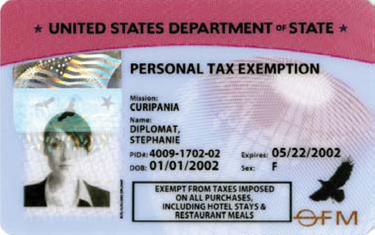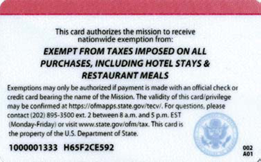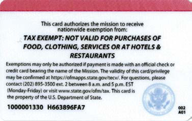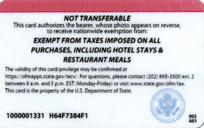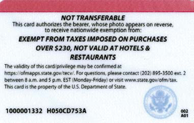 f) Beginning in June 2011, the U.S. Department of State began issuing new types of U.S. Department of State Diplomatic Tax Exemption Cards. The new Diplomatic Tax Exemption Cards are the same size as credit cards, made from plastic, and contain security features such as laser-engraved personalization of data, the inclusion of an optically variable device or kinegram, and tactile micro-text (small raised text). They are valid nationwide. These cards are used at the point of sale for exemption from State and local sales taxes and similar taxes normally charged to customers. Some cards have restrictions on tax-free purchases. Tax exemption cards are not valid for exemption from taxes on telecommunications, other utilities, or gasoline purchases. The cards are not transferable. Only the person whose photograph appears on the front side of the card may use the card. Vendors may ask for additional identification such as a driver's license.