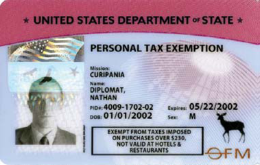 2) Samples of the U.S. Department of State Diplomatic Tax Exemption Cards are for illustrative purposes only. It is important to look at the card to determine the precise exemptions to which the cardholder is entitled. The images below of the four types of U.S. Department State Diplomatic Tax Exemption Cards were taken from the "White Paper Detailing the Department of State's Newly Designed Diplomatic Tax Exemption Cards" found on the U.S. Department of State, Bureau of Diplomatic Security, Office of Foreign Missions website at www.state.gov/ofm/tax/.
