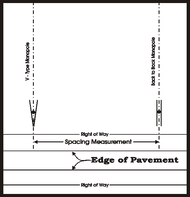 CHAPTER I: DEPARTMENT OF TRANSPORTATION SUBCHAPTER f: HIGHWAYS PART 522 CONTROL OF OUTDOOR ADVERTISING ADJACENT TO PRIMARY AND INTERSTATE HIGHWAYS SECTION 522.ILLUSTRATION K SPACING MEASUREMENT MONOPOLE BACK-TO-BACK V-TYPE Section 522.ILLUSTRATION K Spacing Measurement Monopole Back-to-Back V-Type