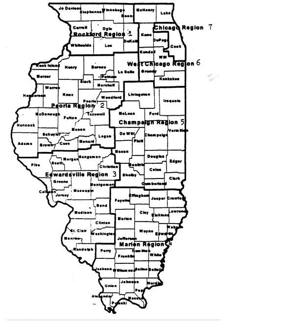 CHAPTER I: DEPARTMENT OF PUBLIC HEALTH SUBCHAPTER l: CHRONIC DISEASES PART 710 ILLINOIS ALZHEIMER'S DISEASE AND RELATED DISORDERS ASSISTANCE CODE SECTION 710.APPENDIX A REGIONS OF ILLINOIS DEPARTMENT OF PUBLIC HEALTH AND REGIONAL ADA CENTERS' SERVICE AREAS Section 710.APPENDIX A Regions of Illinois Department of Public Health and Regional ADA Centers' Service Areas